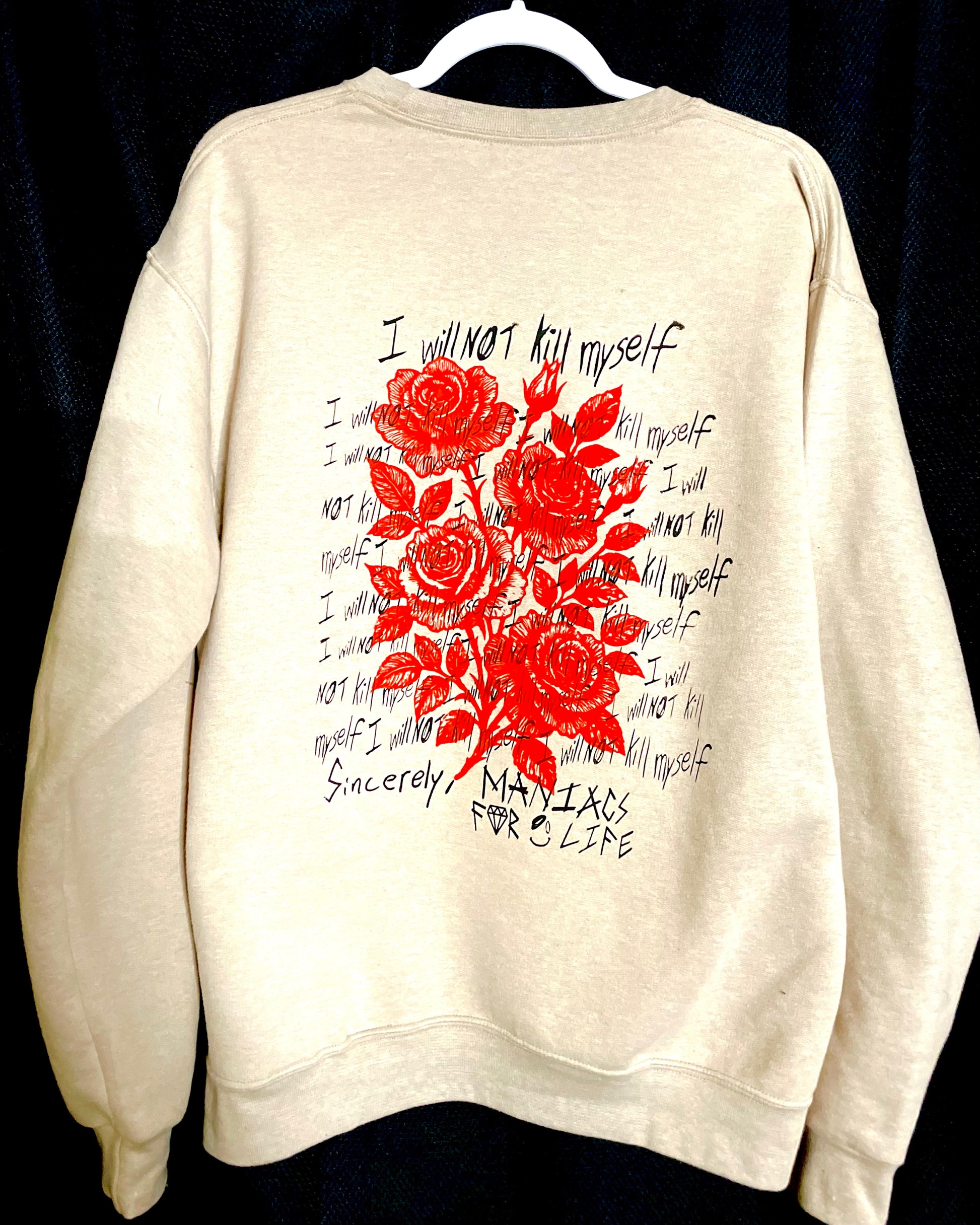 "I WILL NOT KILL MYSELF". THESE SWEATERS ARE FOR THE WORLD TO KNOW HOW YOU STRONG YOU ARE MENTALLY. NO MATTER WHAT HAPPENS AS MANIACS FOR LIFE WE STAY STRONG AND STOP SUICIDE. THESE SWEATERS FIT TRUE TO SIZE