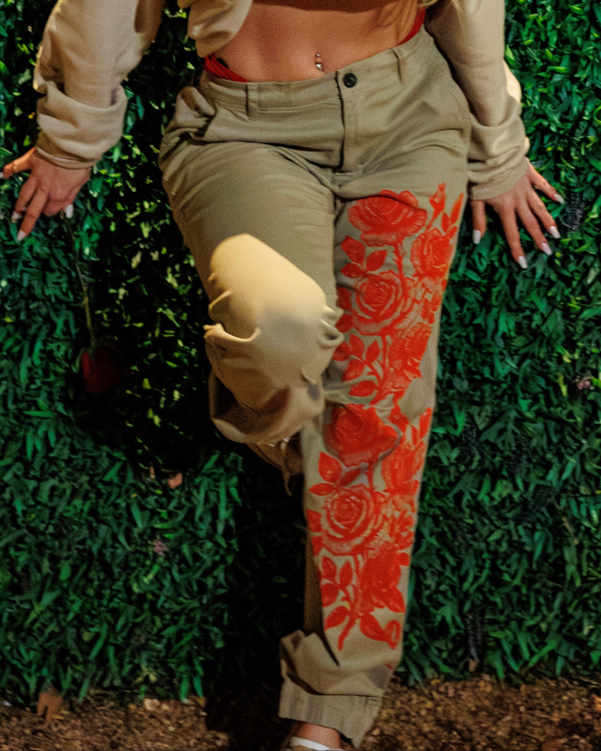 ROSES ON THE LEFT PANT SLEEVE TO SHOW WE GOTTA GO THROUGH DIRT TO GROW INTO SOMETHING BEAUTIFUL! THESE JOGGERS RUN A BIT BAGGY FOR A STREET VIBE.